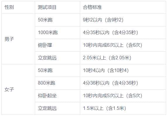 第十五条 报考司法行政警察类专业的考生,必须参加体能测试并合格,体能测试项目与合格标准见下表。以下四个项目中有三项达标的,体能测评结论为合格。